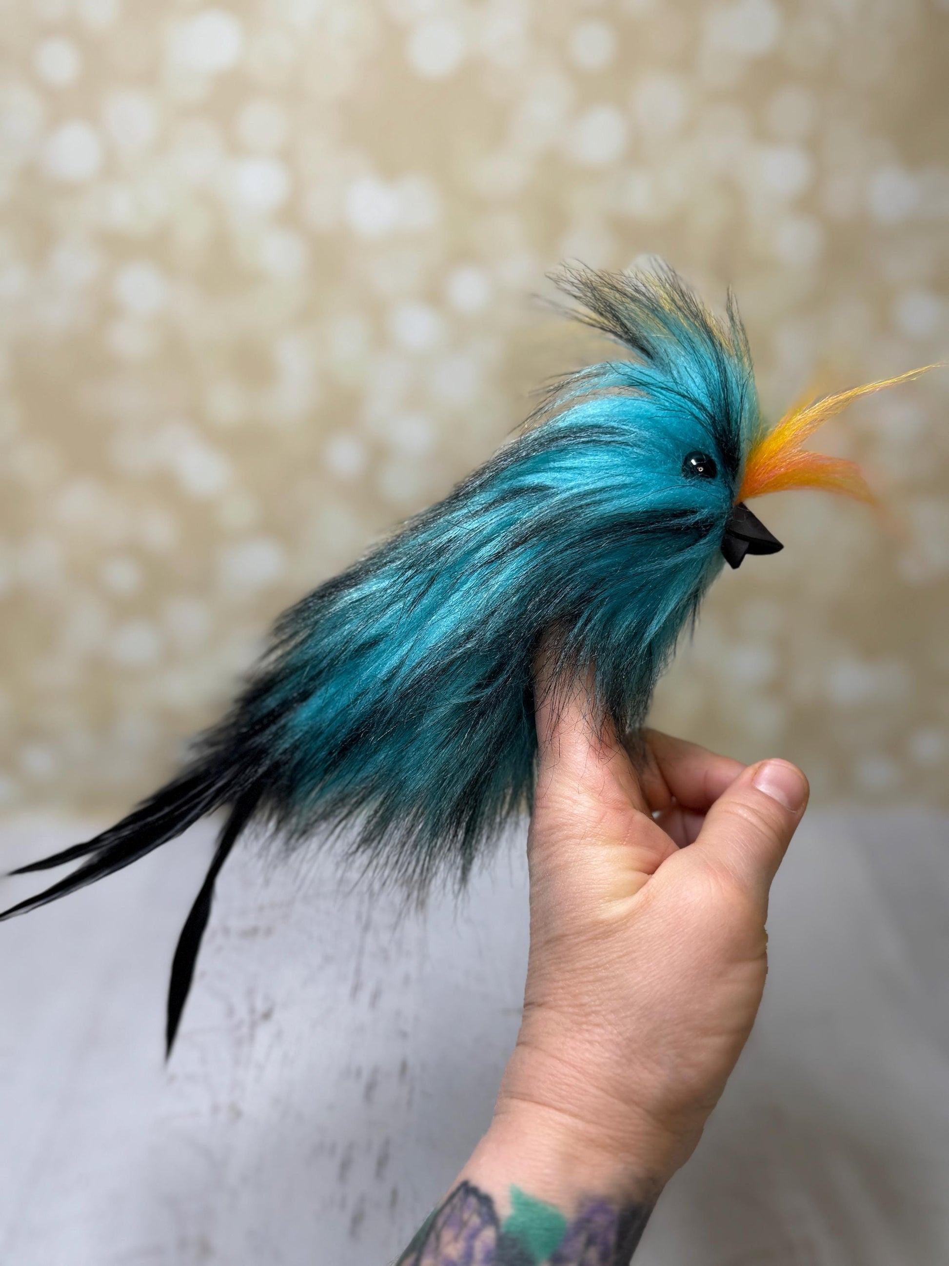 With teal-blue fur tipped in soft black, a plumage of tail feathers, and a tiny crest kissed with hints of orange and yellow, this little rascal is always ready for adventure. Slip it onto your fingers and watch it swoop, wiggle, and charm everyone in sight.