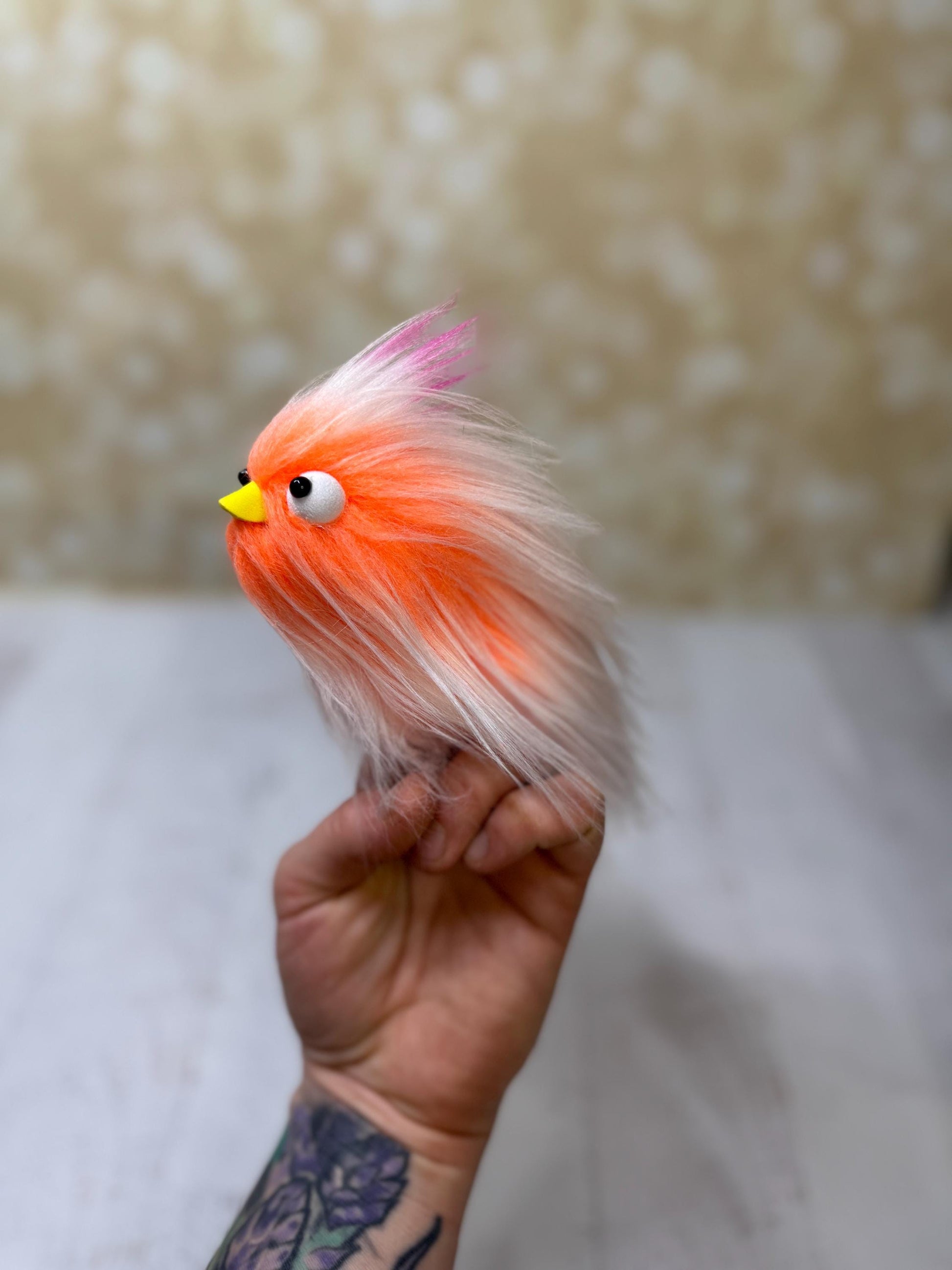 This tiny friend is wrapped in soft white fur kissed with vibrant orange, creating a dreamy sherbet swirl effect. A splash of pink at the crest gives it a playful pop of color, while its expressive round eyes and tiny yellow beak make it irresistibly curious and full of personality.