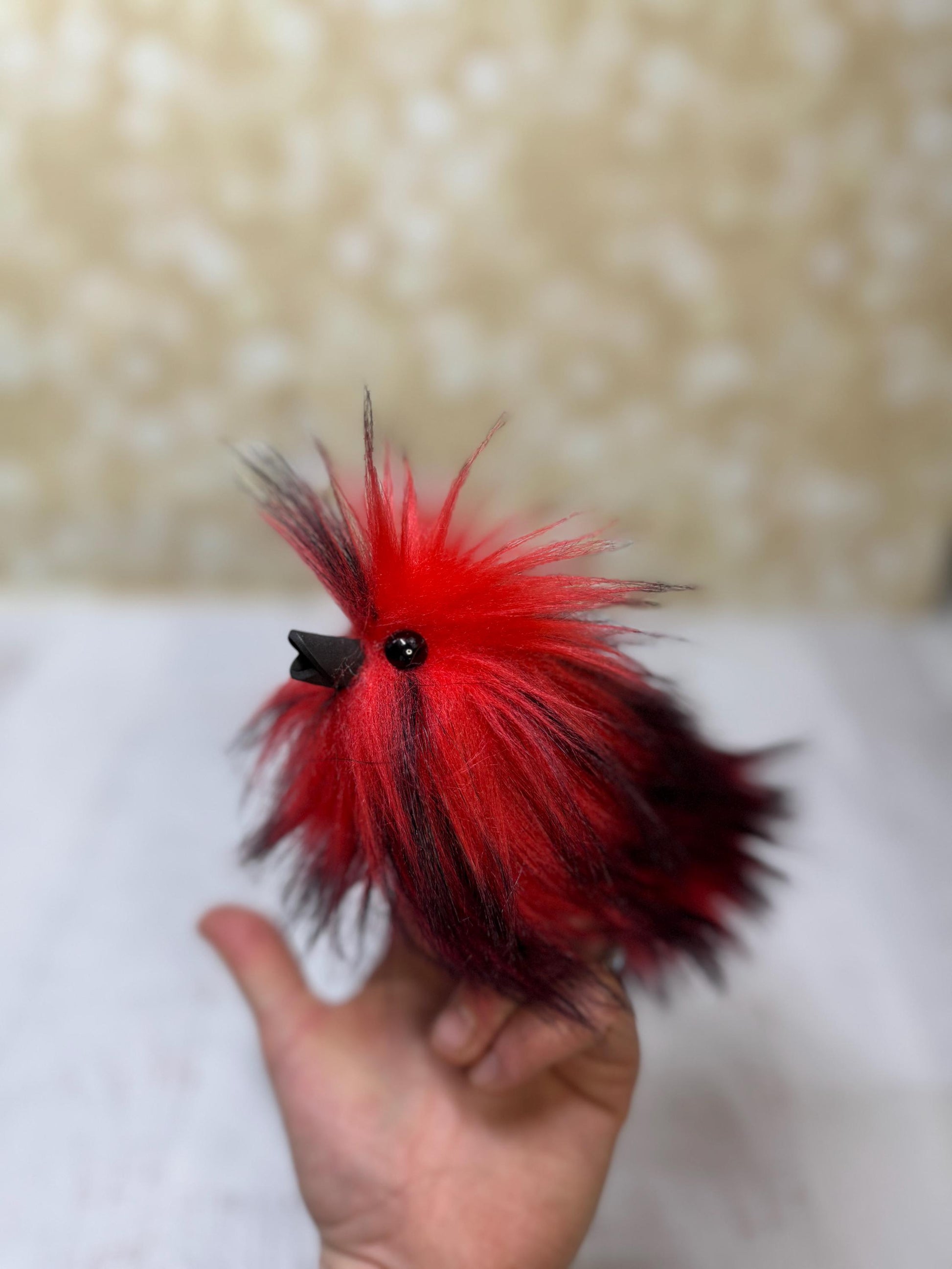 Its fur blazes in vibrant red with inky black tips, giving it the look of a spark that jumped straight out of a magical campfire. Perched on two fingers, this fluffy mischief-maker wiggles, pops up to say hello, and immediately steals the spotlight with its adorable round eyes and spirited energy.